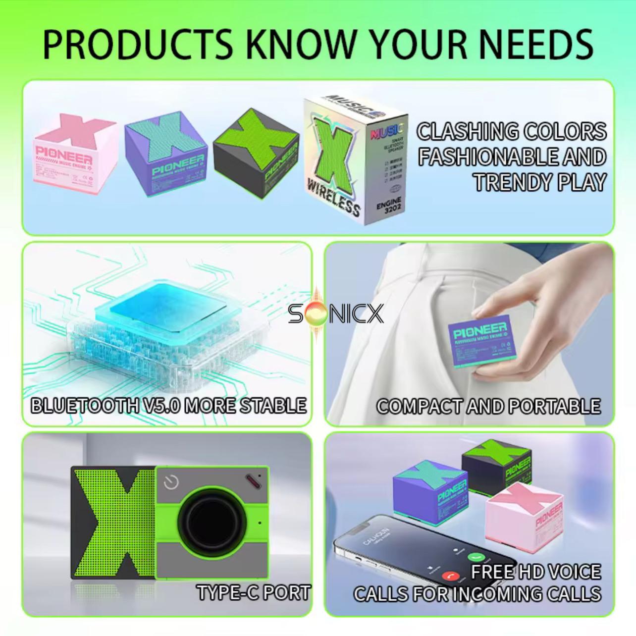 SonicX -X Small: A pocket-sized, ultra-portable speaker with a sleek, modern design. Perfect for everyday use, this mini speaker delivers powerful, high-quality sound. Take your music on-the-go with SonicX.
